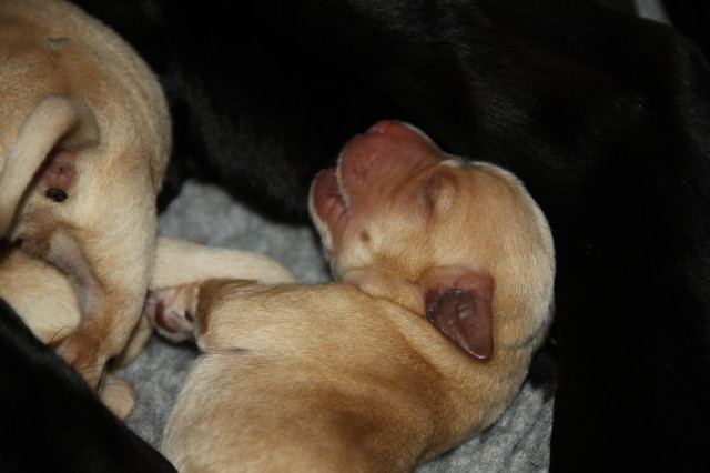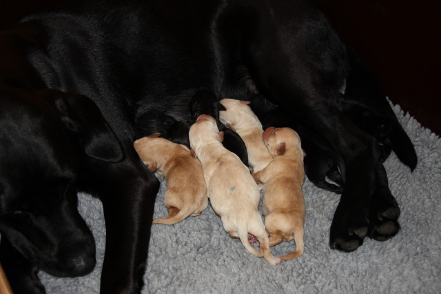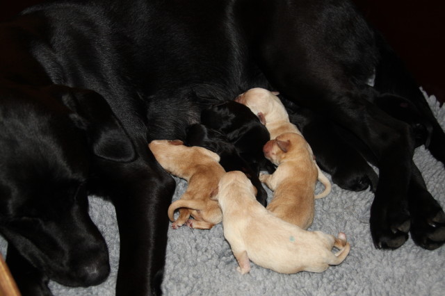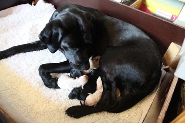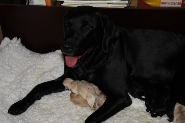Wir haben vier gelbe Hündinnen, drei schwarze Hündinnen und einen schwarzen Rüden bekommen, vier sind auf natürlichem Weg und vier per Kaiserschnitt geboren.
